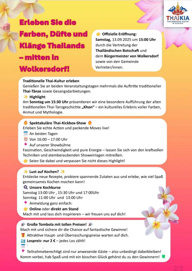 Unser Angebot ist einzigartig, denn wir holen das authentische Thaifestival nach Wolkersdorf! Erleben Sie die Vielfalt thailändischer Traditionen, von farbenprächtigen Tänzen bis hin zu kulinarischen Köstlichkeiten. Ein Fest für alle Sinne!